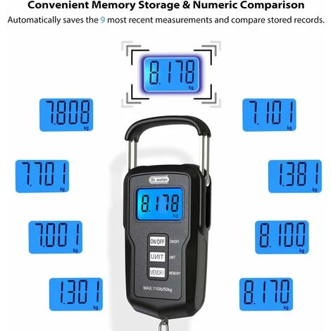 No tackle box is complete without the electronic fish scale! This scale is our latest and greatest – a crystal clear LCD screen, specialized features like memory, numeric comparison, unit conversion, tare and more are perfect for both the amateur and enthusiastic angler. Just turn it on, hang your hook on the stainless steel hook and let Dr.meter do its thing. Do you need to measure the length? We have included a tape measure to help you measure. Measure catches up 3 feet long. Not to the outside? No problem. This scale is a great tool to weigh your luggage and avoid high fees. Make your life easier with Dr.meter! functions ? Functions: tape measure, blue backlight, tare/zero, auto power off, data lock, unit conversion, memory, addition, numeric comparison • Overload indicator and low battery indicator • High Precision Strain Gauge Sensor ? Stainless steel hanger and slot. hidden hook • Weight range: 0-10kg: d=5g, 10-50kg: d=10g ? units: kg, lb, oz ? Power supply: 3V (2 AAA batteries) • Working current: backlight on; = 10 mA, backlight off; = 5mA? Operating Temperature: 50°-104°F Package Contents 1 x Upgraded Electronic Fish Scale 1 x User Manual
