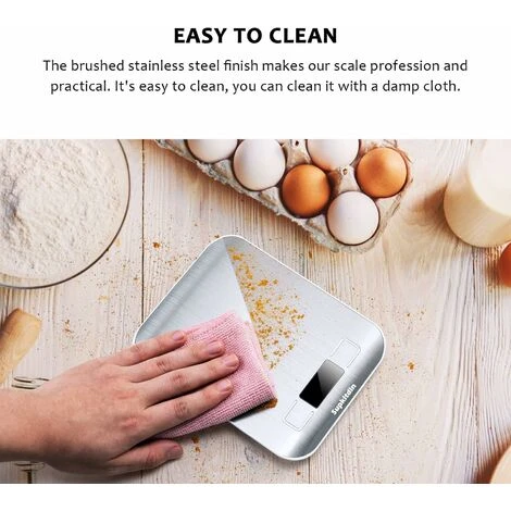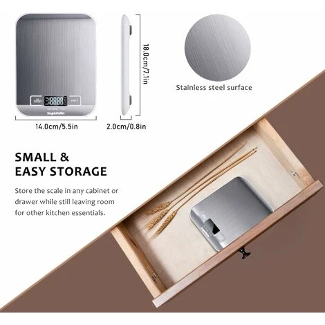 Small digital kitchen scales Rounded corners, beveled edges, easy-to-clean stainless steel clean These stainless steel food scales are the best friend of your culinary creations. With a capacity to go up This 5kg scale has a handy tare function to easily measure the ingredients in a dish, allowing you to reduce prep time. Whether you’re a beginner or a seasoned chef, this digital scale is easy to use. and practicality to create the perfect kitchen creations.