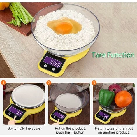 Features: Brushed stainless steel weighing pan. Clear LCD display with purple backlight. g, oz, lb, 3 switchable weighing units. Non-slip bottom. Accurate electronic kitchen scale. Multi-function functions of tare function, 60 seconds auto power off and overload protection.Features: Capacity: Black-5kg/1g, Yellow-3kg/0.1g (optional)! Material: ABS+stainless steel Unit: g, oz, lb Power supply: 2*1.5V AAA battery (not included) Display screen size liquid crystal: 4.8 * 1.8cm / 1.89 * 0.71in! Pan diameter: 12.5cm / 4.92in Item size: 18 * 13.5 * 2.6cm / 7.09 * 5.31 * 1.02in Item weight: 196g / 6.91 oz Package Weight: 264g / 9.31oz! Package Size: 18.3 * 15.5 * 3.7cm / 7.20 * 6.10 * 1.46in Package List: 1 * Scale 1 * Manual (English)Package List: 1 * Scale 1 * Manual (English)