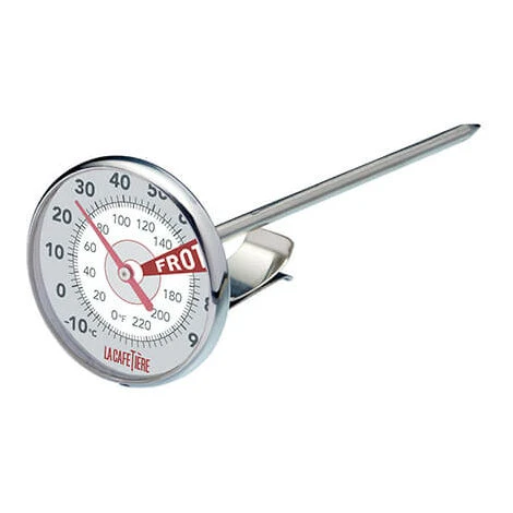 The thermometer features a temperature range from -10° to 90°C / 0°C to 220°F with a red zone at 70°C / 150°F which indicates that you milk is at the perfect temperature for frothing.