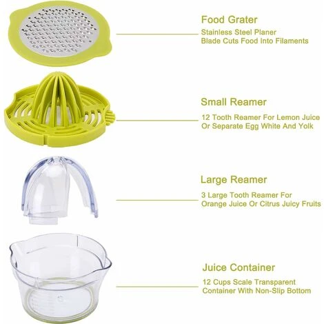 - 4 in 1 Orange Squeezer – The juicer consists of two reamers of different sizes, a grater and a 400ml fruit container. The transparent large reamer of the juicer is suitable for making orange juice and grapefruit juice; Small green orange juicer reamer is suitable for lemon and strained egg white. The diameter of the juicer is 14.5 cm, the height is 7.5 cm and the size of the grater is 14.5 x 12.5 cm. It can grind ginger and garlic into pieces.