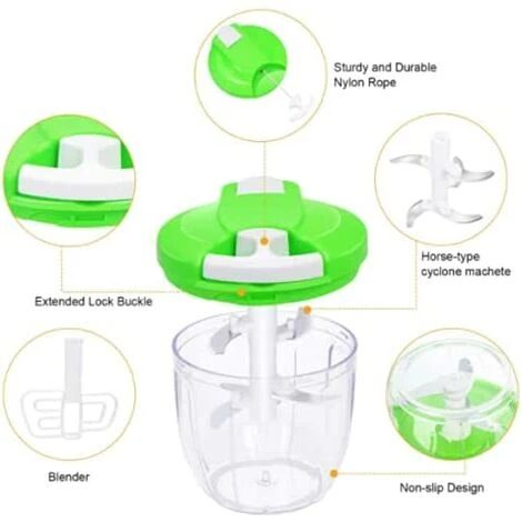 High quality + security + health +: Our manual grinder is made made of high quality ABS plastic used in food processing and does not contain BPA. É that the cutting process is done at Using a detachable rope, it is safe for the whole family. Safe to use, no electricity, no pollution, no noise, this type of chopper is very suitable for for kitchens, vans, RVs, travel and summer camping.