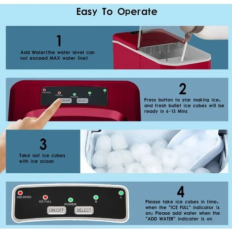 - 【Automatic Ice Maker Countertop】:No installation needed. Just add some water, press ON/OFF button, select ice size. It only takes 6-10minutes then you can enjoy your iced drinks. Automatic Power-Off function and LED indicator are activated when the machine is lack of water or the ice basket is full.
