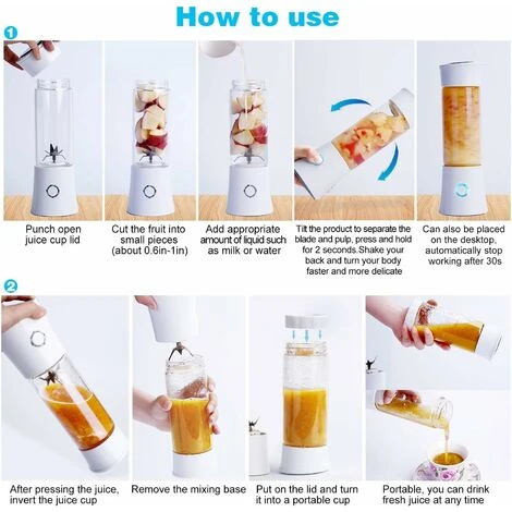 POWERFUL AND EASY TO USE: With 7.4V Double Motor + 4 steel sharp blades stainless steel, it only takes 10-20s for you to make a glass of juice, milkshake, smoothie, etc. The spoiler bulge inside the bottle enhances convection and fruit collision, resulting in a smoother and richer flavor. It will not leave fruit residue and not noisy like the traditional ones.