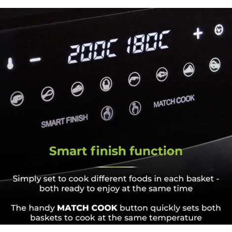 Enjoy your favourite fried foods made healthier and quicker with the Tower 9 Litre Dual Basket Air Fryer. With a large capacity and two separate 4.5 litre non-stick cooking baskets you can cook two different dishes at the same time. Use the handy Smart Finish function so both dishes finish cooking at the same time or us the Match Cook option to quickly set both baskets to cook at the same temperature. An air fryer is a healthy way to fry food – using 99% less fat than conventional deep frying you only need to use a teaspoon of oil to get the same tasty results.