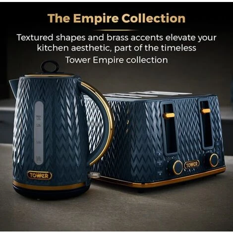 The Tower Empire 1.7 Litre Kettle and 4 Slice Toaster Set features a grey geometric design with brass accents will add a touch of style to your kitchen.