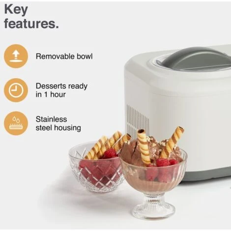 Make your own gelato, sorbet or frozen yoghurt from your kitchen. For quick results making desserts that will be ready within the hour, create your own custom flavours with this easy-to-use 100W ice cream machine, capable of making 1L of ice cream.
