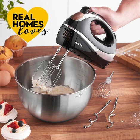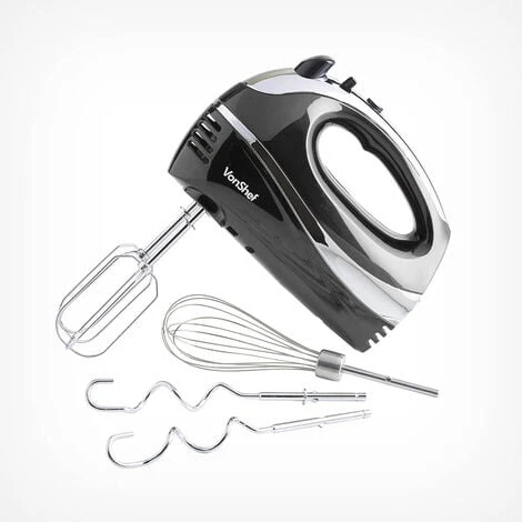Our VonShef Hand Whisk comes with 5 impressive components that allow you to do a variety of cooking techniques at great ease and convenience. The durable chrome dough hooks make mixing dough and heavier cake mixes easy. The chrome beaters are perfect for whisking egg whites, creaming ingredients and for light cake mixtures or batters.